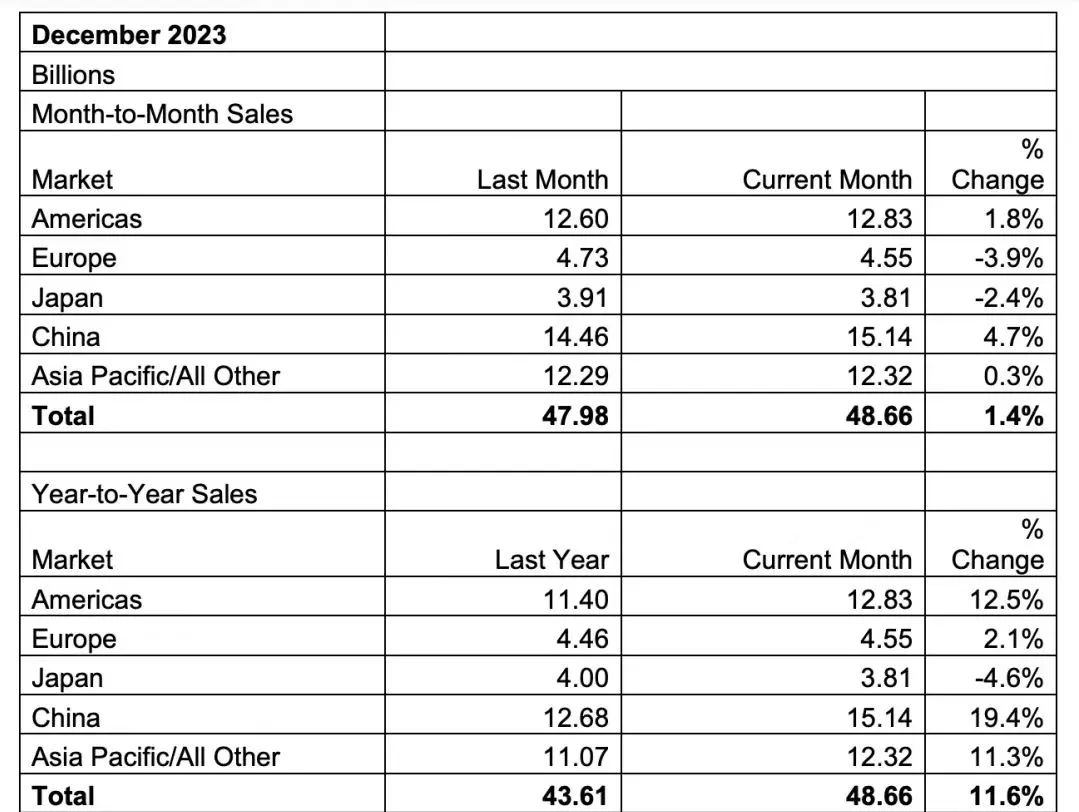 2023年下半年销售额有所回升。第四季度销售额为1460亿美元,比2022年第四季度总销售额增长11.6%,比2023年第三季度总销售额增长8.4%。2023年12月的销售额为486亿美元,较2023年11月总额增长1.5%。