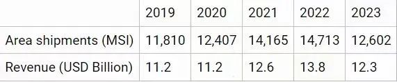 SEMI(国际半导体产业协会)报告显示,2023年全球硅晶圆出货量为126.02亿平方英寸,较上年下降14.3%,营收为123亿美元,下降10.9%。这一下降的原因是终端需求放缓,加上广泛的库存调整。内存和逻辑芯片行业需求疲软导致12英寸晶圆订单下降,而代工和模拟需求疲软导致8英寸晶圆出货量下降。