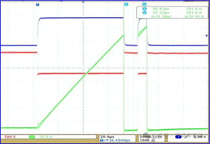 中国科学院电工研究所基于芯片产品SG2MA35120B完成了低杂感半桥模块封装,双脉冲测试波形如图6所示。